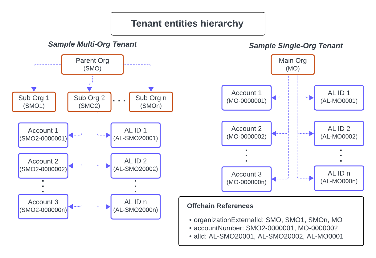 The diagram below expounds how offchain references, used very frequently through most of the API endpoints, fit within a tenant's hierarchy.alIds - map to financial instruments
